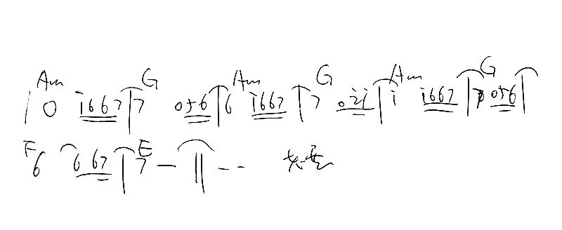 四个和弦就写四个小节,就会显得篇幅很不够丰满,比如四个和弦:Am-G-F-E,就可以这么做:
