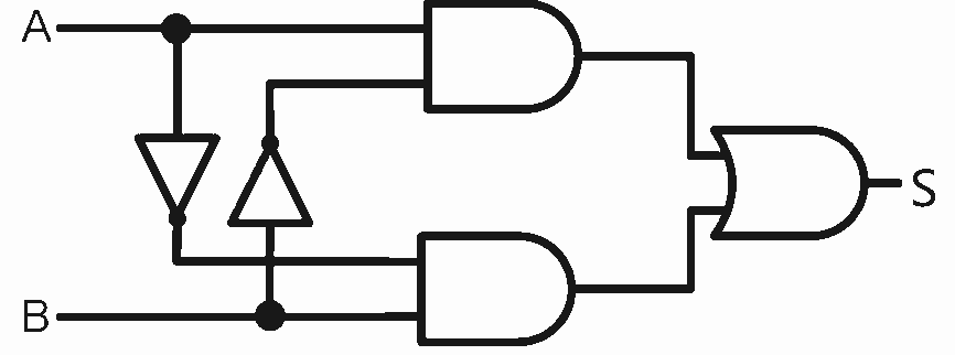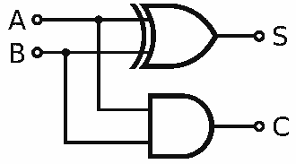 根据逻辑表达式,可以得知,只需要一个异或门和一个与门便可实现半加器。当A和B为1时,即1+1,S为零,C产生一位进位,得到10。