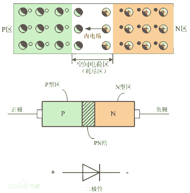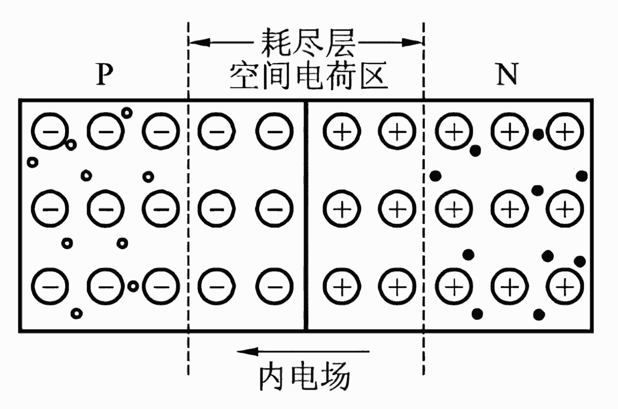 将p型半导体与n型半导体制作在同一块硅片上,在它们的接触面,作为p区载流子的空穴向n区扩散,此时p区因为失去空穴而带负电;同理有,n区的电子向p区扩散,失去电子的n区则带正电,扩散最终达到动态平衡,就形成了PN结,在这个区域几乎没有载流子,所以它被称为 “耗尽层” 。