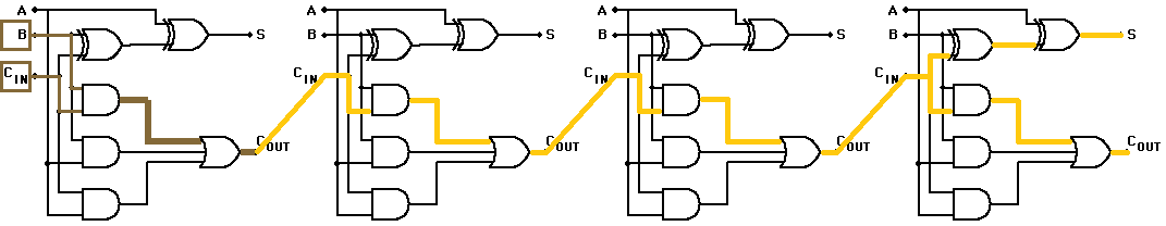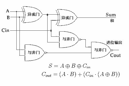 全加器的门电路实现,将n个全加器级联起来,就是一个n位的加法器,这就是逐级进位加法器。如果位数n很大的话,整个加法器会变慢,最后会限制CPU主频的提高。