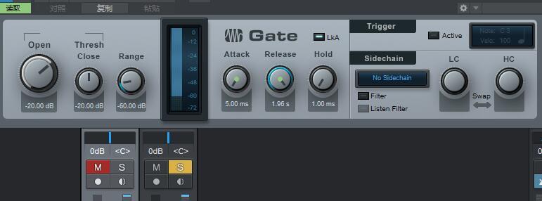 噪声门与压缩器一样,也可以玩侧链滤波,也有处理立体声的噪声门(得知道有立体声绑定的概念)。值得一说的是很多噪声门也有前视(Lookahead)功能,所谓前视,其实就是提前去探测信号的状态,也就是预先知道下一刻的信号是超过了阈值还是低于阈值,从而可以提前切换成开门状态,这样会更好的保留信号的瞬态(启振过程),又能避免超短的建立时间所造成的咔嗒声或者其它类型的信号失真。前视功能会造成额外的延迟,当然了,当今的DAW或者插件大部分都会有自动延时补偿功能。