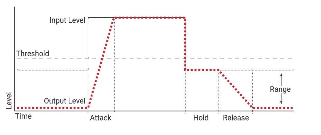 顾名思义,噪声门的主要用途就是用来衰减低于阈值的信号,而这种被衰减的信号通常就是噪声。在录音棚或者家庭录音室中,噪声门可以解决录音设备的底噪,电脑的风扇声,空调工作的声音,乐器串音,监听耳机的泄漏音等问题,当然,噪声门的处理对象远不止这些。 除了“消除”噪声,噪声门还可以用来塑造声音的动态包络,从而到达到某些效果,如增加冲击力等。