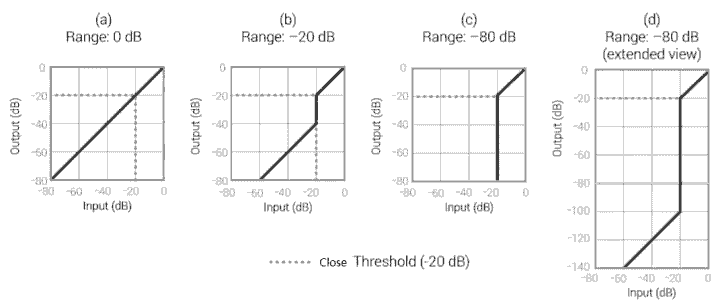 笔者喜欢将此参数简称为衰减量。通常情况下,该参数决定了低于阈值(Close Threshode)的信号要被衰减多少。在使用噪声门时,衰减量往往都会被设置的比较大,如-40dB、-60dB,这种设置会从听感上让我们误以为门限下的信号被哑音了,而实际上只是衰减量太大而已。在图5中,a是0dB的Range,b是-20dB的Range,c是-80的Range,d是-80dB的完整视图。