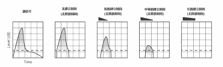 建立时间指的是噪声门开门的速度,举例来说,一个-60dB的Range,当信号超过开门阈值后,衰减量从-60dB到0dB所耗费的时间就是噪声门的建立时间。如果建立时间被设为6ms,那么每毫秒会增益10dB,如果这个时候将Range改设为-30dB,那么每毫秒会增益5dB,所以Range与Attack都会影响信号的动态包络。要想学习它们是怎么影响动态包络的,最好使用夸张的建立时间来对比。在图6中,逐渐变长的建立时间会使音头慢慢被削弱(配套视频中有演示),直至整个音符完全消失,这就好比-60dB恢复到了-55dB的时候,音符已经完全播放完毕了,所以整个音符都听不到了。