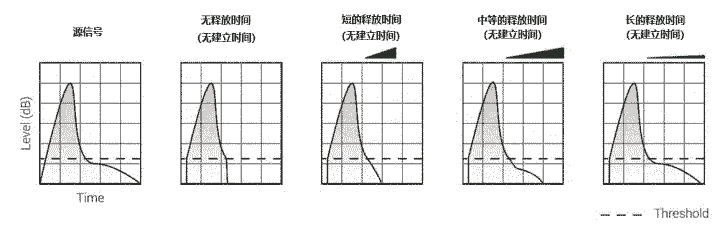 释放时间与建立时间相反,其指的是噪声门关门的速度,举例来说,一个-60dB的Range,当信号低于关门阈值后,从0dB的衰减量到-60dB的衰减量所耗费的时间就是释放时间。在图7中,逐渐变长的释放时间会保留更多的尾音,也会保留更多你不需要的声音(如噪声)。