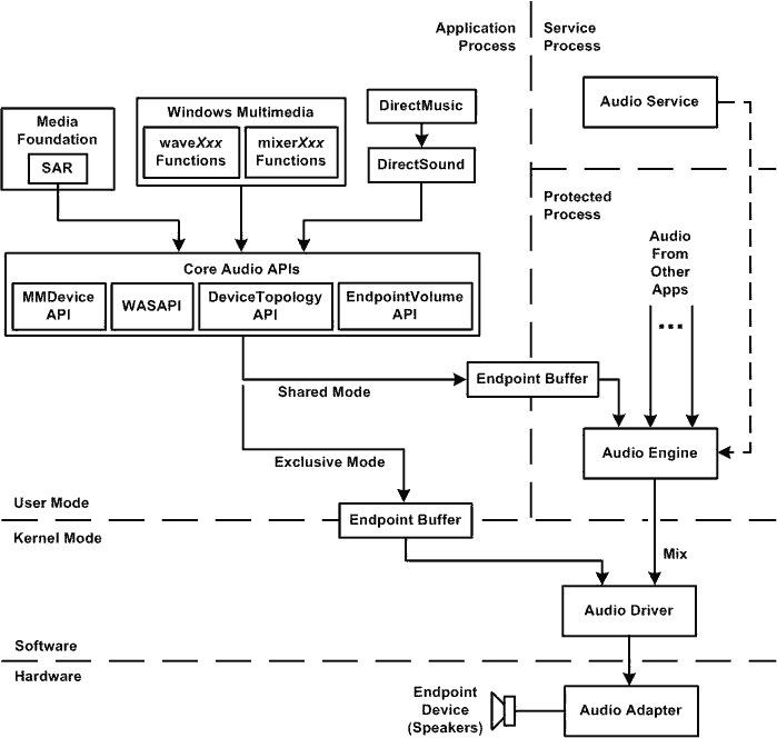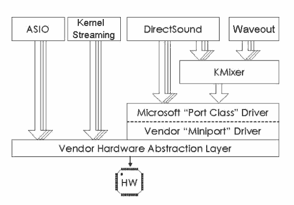 需要注意的是由于Vista和Win7开始弃用了kmixer和依赖dma的audio IO,所以Kernel streaming不适用于Vista和Win7。
