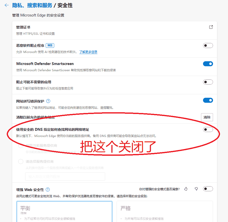下面这张图就是设置Edge浏览器安全DNS的设置选项,关掉这个功能之后最有可能解决你的问题。